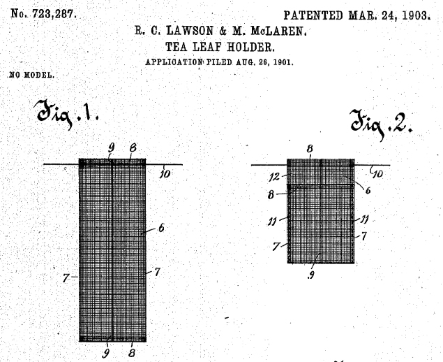 WRONG! We’re going back here to the “51 Tea Facts” website from our first false “fact” above. This is their second piece of trivia, and so far, they’re batting zero. Again, they tell a fun story, but the story doesn’t address United States Patent #723,287, which was filed in 1901 and issued in 1903.