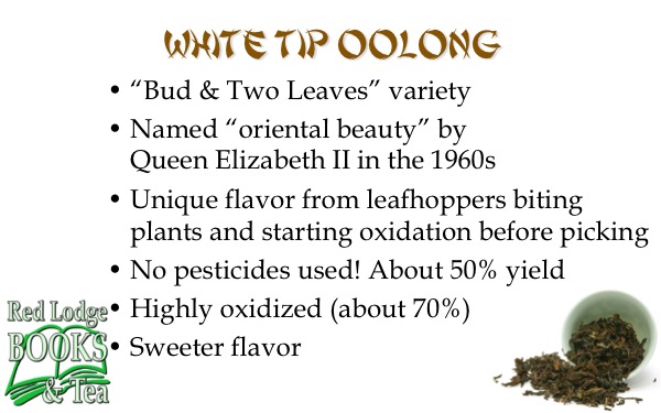 Here’s a tea with many names, including Bai Hao in the east and Oriental Beauty in the west. In the beginning, it was known as “bragger’s tea” because of the origin story (one of the stories that will appear in my new book, by the way), where a farmer went ahead and used leaves that had been chewed up by insects and discovered that the flavor was so wonderfully enhanced that he got twice his normal price at market.